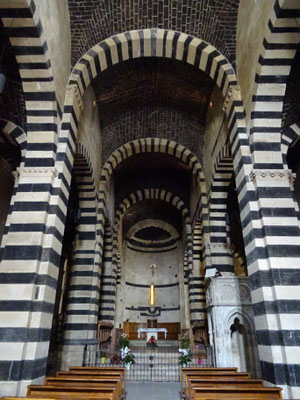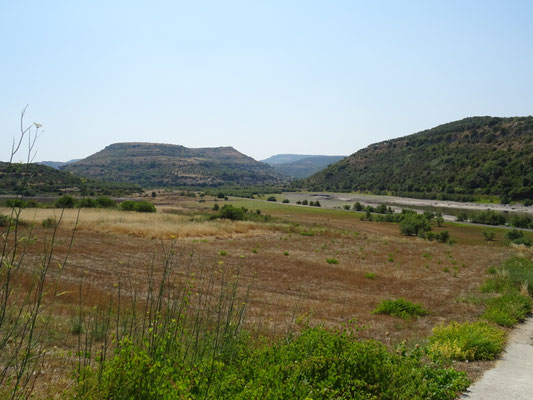 Wir fahren landeinwärts über Itteri bis nach Thiesi, vorbei an einer schönen Landschaft mit zwei Seen. In Thiesi kaufen wir noch Wasser und Aufschnitt und fahren weiter ins Valle dei Nuraghi. Dort essen wir auf dem Parkplatz der Nuraghe Santu Antine unser Mittagessen und besichtigen danach die gigantische Nuraghe. Wir streifen durch alle Gänge und steigen die Wendeltreppe der Bastion bis in den dritten Stock hoch. Die Aussicht ist himmlisch und es sind noch weiter Nuraghen zu sehen. Weiter gehen wir zu den Höhlengräbern von Sant'Andrea Priu. Leider sind diese Gräber wegen Bauarbeiten geschlossen worden. Wir fahren wieder zurück Richtung Thiesi nach Logudoro um die Kirche San Pietro de Sorres und die dahinter versteckte Nuraghe zu besichtigen. Die Frau vom Tickethäuschen führt uns durch Kirche und Klosteranlage und erklärt uns die wichtigsten Sachen in Italienisch. Die romanische Kirche ist aus weissem Kalkstein und schwarzem Basalttuff aus dem 12 Jh.