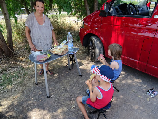 Heute Morgen erwachen wir um 7.30 Uhr. Wir haben festgestellt, dass es gut ist, wenn die grossen zwei oben schlafen und Lars und ich mit Andri in der Mitte unten. Wir haben dann alle Türen offen und mit Mückennetzen bedeckt.