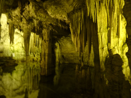 Bereits um 8.30 Uhr holen wir an der Rezeption unsere Gipfeli und das Ciabatta und fahren zur Neptungrotte. Wir sind bei der ersten Führung dabei und können ganz vorne beim Wendepunkt parkieren. Die 651 Treppenstufen gehen ganz gut nach unten zur Grotte. Man kann 500 m in die Grotte hinein laufen. Es ist sehr imposant. Nach der 45-minutigen Führung steigen wir die Treppen wieder hinauf, zum Glück ist es noch am Schatten. Die Aussicht von der spektakulären Treppe ist wunderschön.