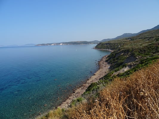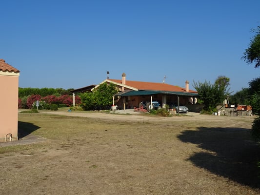 Über Cuglieri fahren wir über wundersame Berglandschaften und Korkeichenwälder zurück an die Küste und zweigen dann auf die Halbinsel Sinis ab. In Porto Putzu rufen wir den Agriturismo Il Ginepro an, doch niemand meldet sich. Wir fahren kurzerhand weiter zum Strand Is Arutas und besichtigen dann den Campingplatz. Dieser gefällt uns aber gar nicht und so baden wir am Strand mit vielen anderen Italos (es ist ja Samstag) und fahren dann gegen sechs zurück zum Agriturismo. Die Gastgeber sind sehr freundlich und wir sind die einzigen auf dem Stellplatz. Abends essen wir im Ristorante von den Gastgebern, auch als einzige. Wir bekommen Pasta mit Bolognese als Primo Piato und dann dreierlei Fisch (Dorade, ein anderer Fisch und Fritierte) dazu gibt es Salat aus dem Garten, selbst gemachter Wein, Pommes, panierte Auberginen. Es hatte reichlich und zum Dessert gab es Wassermelone und dreierlei Schnäpse. Einen Mandarinen, einen Aqua vitale (Grappa), und Wachholder. Ein tolles Erlebnis!!!