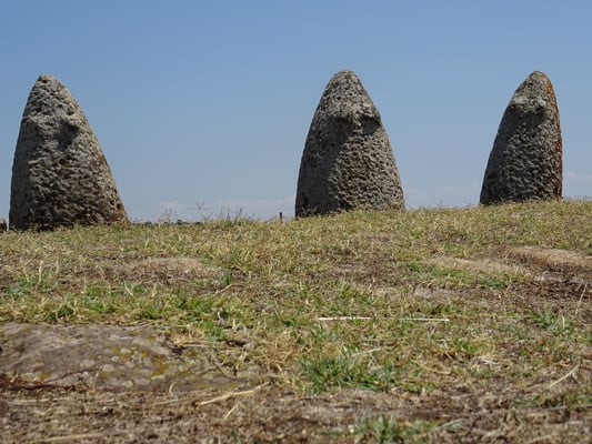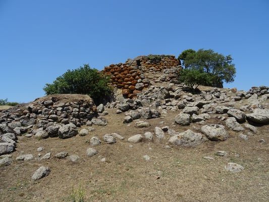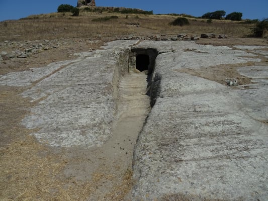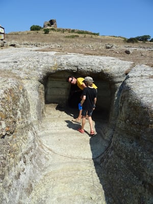 Bei Bosa nehmen wir dann die Inland-Route nach Macomer, um noch einige Stätten aufzusuchen. Bei den Necropoli dii Filigosa machen wir eine interessante Führung durch verschiedene Felsengräber. Der Mann erklärt uns, wie man erkennt, dass Gräber später durch die Nuragher und die Römer wieder genutzt wurden. Die Filigoser waren aus der späten Steinzeit. Nicht weit entfernt erkundeten wir noch die Nuraghe und die Gräber bei Tamuli. Es ist 38 Grad warm und die Fahrt geht weiter zu den Siete Fuentes di San Leonardo. Da essen wir ein Picknick mit Käse und Brot, Tomaten und Salami. Danach besichtigen wir die Quellen und den Park, in einem Café trinken wir Cappuccino und die Kids nehmen ein Glace.