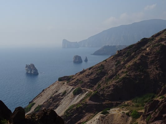 Die Strasse wird immer enger und Lars fährt ganz konzentriert, rechts nicht in die Gräben und Büsche, links keine Kollision mit einem Auto. Die Strasse kurvt und windet sich mal auf den Berg weg von der Küste und dann wieder zurück. Die Landschaft ist wild und grün und kaum ein Gebäude zu sehen, nur alte Ruinen. In der Nähe von Arbus hat man einen bezaubernden Blick aufs ganze Tal und auf eine alte Miene und deren Wohngebäude / Ruinen.