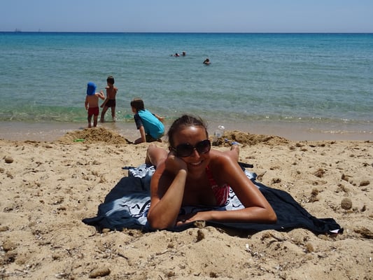 Heute Morgen bestaunt plötzlich ein deutsches Ehepaar unser Auto und wir tauschen unsere Tipps und Ideen aus, da sie auch einen California zu Hause haben, sich aber nicht mit Auto in die Ferien trauten. Sie gaben uns den Tipp von einem angrenzenden Strand "Monte Cogoni". Wir machen uns also heute dahin auf, gehen aber mit dem Auto, da die Jungs mit all unserem Strandzeug wohl nicht so weit laufen mögen. Wir füllen noch unseren Proviant auf in einem Shop eines Nobelhotels. Da hat es feine und gute Sachen, auch Geschenkideen. Dann lösen wir mal wieder ein Parkbillett für den Strandparkplatz. Die Dame sagt noch was, von nur in gekennzeichneten Feldern... Doch wir kassieren eine Busse, da wir im Parkverbot stehen. 30 €!