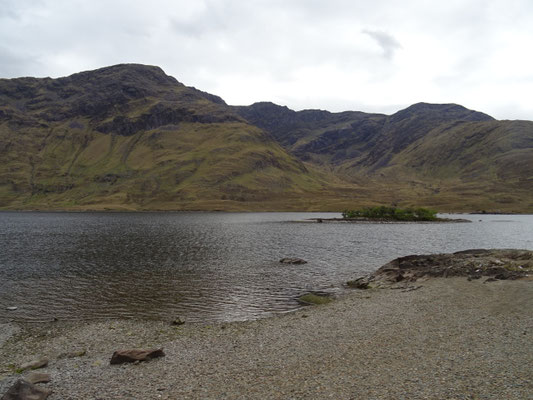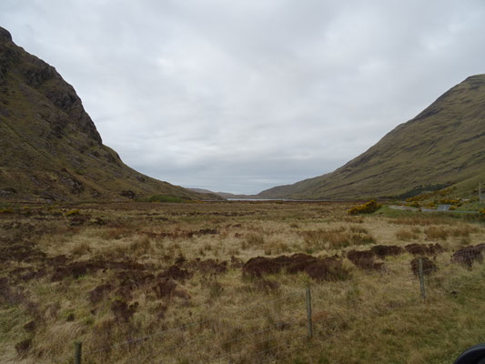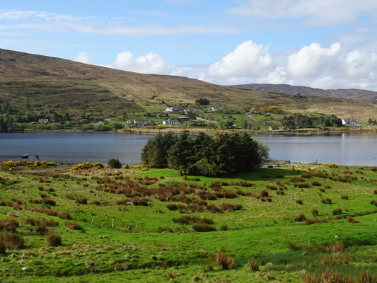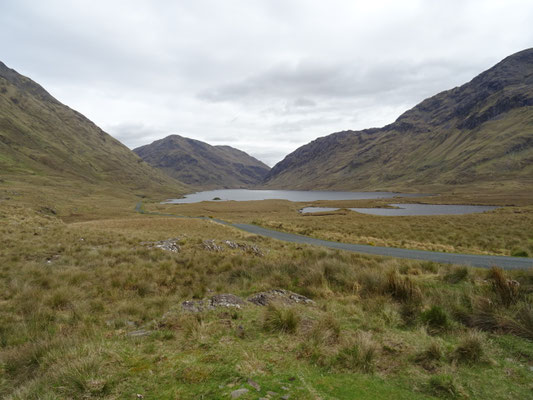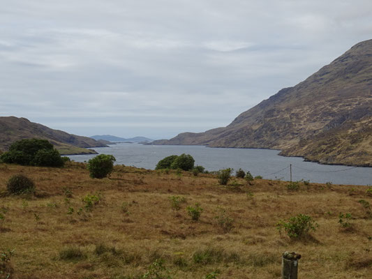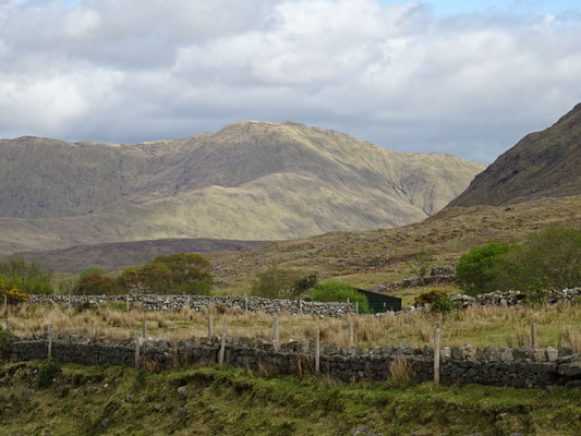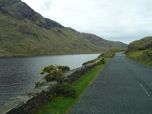 Wir fahren weiter bis nach Leenane und staunen über den langen Meeresarm und die spektakulären Ausblicke von der Küstenstrasse in den Killary Harbour. Wir verlassen die N59 und nehmen die R335 am Kopf des Fjords. Die Landschaft wird immer karger und unwirklicher, keine Häuser mehr, Bergkegel, Seen und Moore. Wir fahren über den Doolough Pass, welcher am Doo Lough (See) vorbei führt. Wie in einem Märchenland.