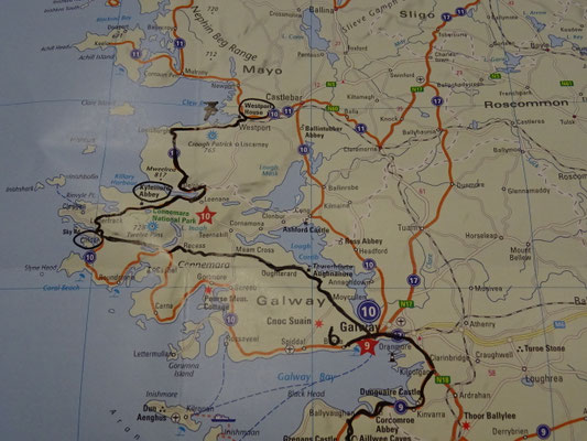 Heute liegt die schöne Gegend der Connemara vor uns. Wir nehmen die direkte Strasse N59, welche am Rande des Nationalparks vorbei fährt. Die Gebirgskette The Twelve Bens liegen auf unserer rechten und im Tal erstrecken sich Seen, Flüsse und Moore. Eine sehr schöne Gegend.