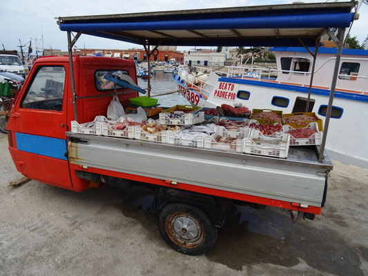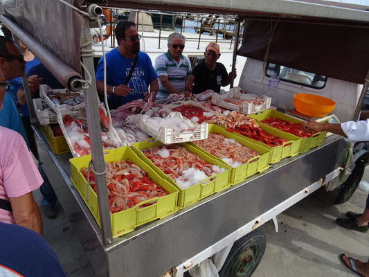 Als wir am Hafen auf die Fähre warten kommen gerade zwei Fischerboote mit ihrem Fang heim. Das interessante Verhandeln und Treiben lockt auch uns an. Einige frische Fische und Gamberi werden gewogen und über die Theke geschoben, kurz darauf fährt ein Kleintransporter mit den vollen Kistchen davon.