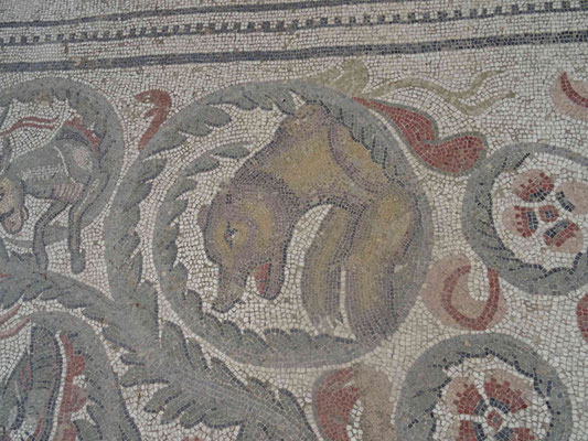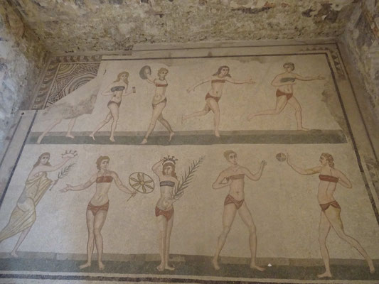 Wir fahren weiter. Die Landschaft wird immer bewaldeter und sehen von der Autostrada aus schon die glänzende Kuppel der Kathedrale Santissima Assunta.. Etwas ausserhalb dann fahren wir auf den Parkplatz der berühmten Villa Romana del Casale. Diese gehört zu den 10 Top-Must-See Plätzen. Genauso touristisch ist es da dann auch. Aber der Eintritt und die Audio-Guide auf Deutsch haben sich wirklich gelohnt. Diese wahnsinnig riesige Villa gehörte wahrscheinlich Kaiser Maximilianus Herculinus 330 v. Chr. oder einem anderen römischen Grossgrundbesitzer. In der Villa sind besonders die 3500 m2 Bodenmosaike in den verschiedenen Räumen zu bestaunen. Wahnsinnig eindrücklich!!! Die Ausgrabungen und Restaurationsarbeiten sind erst gerade abgeschlossen worden.