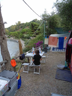 Am späten Nachmittag fahren wir zum Camping Platz Riva Smeralada vorne am Capo. Bei einem einfachen Nachtessen geniessen wir die herrliche Aussicht.