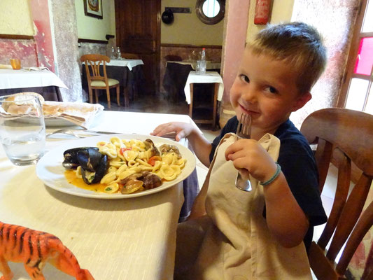 Wir finden das kleine Restaurant Al Pescatore auf Anhieb, sind aber noch etwas zu früh. Hier kommt man erst um 13.00 Uhr zum Mittagesssen.