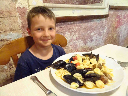 Wir bestellen Oriecchietti con Cozze e Vongole zum ersten und danach Tagliato di Tonno und Millefoglio di Pesce Spada und selbstgemachtes Eis.
