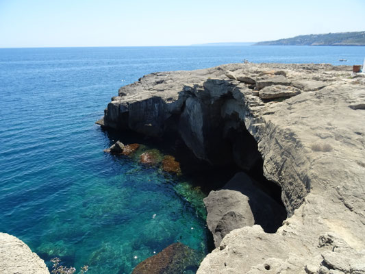 Kurz vor Leuca steigen wir aus und bestaunen die vielen Meeresgrotten, welche in den Klippen entstanden sind. Wir fahren in den Ort rein und setzen uns beim Strand in eine Bar.
