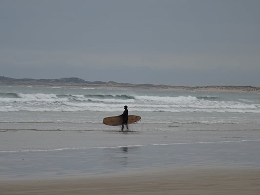 Etwas weiter finden wir eine flachen, langen Sandstrand, wo sich einige hartgesottene Surfer mit vollem Neoprenanzug versuchen. Es scheint, als campierten diese da schon länger.