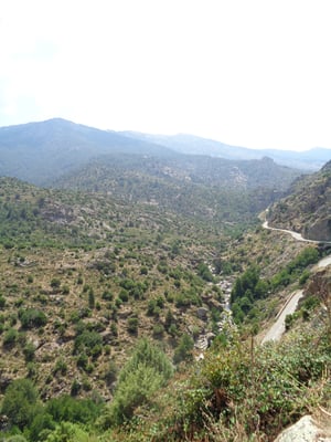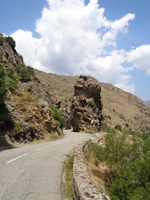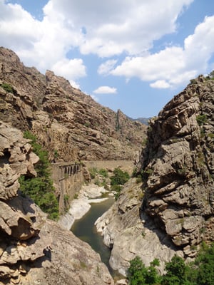 Plötzlich wird die D 84 wieder enger und wir schlängeln uns durch die karge und wilde Schlucht des Flusses Golo. Sie wird wegen ihrer Felsbrocken auch Scala di Santa Regina genannt. Grandiose Ausblicke auf steile Felswände und nach unten zum Fluss bieten sich an.