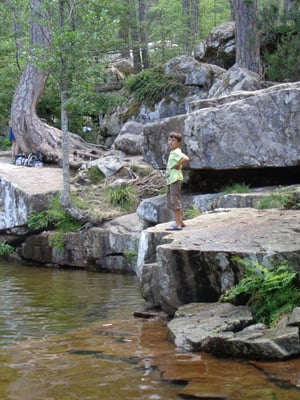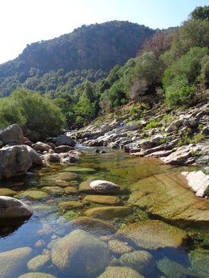 Nach Evisa eröffnet sich ein ganz neues Landschaftsbild. In mitten der Felsen und Berge fahren wir duch einen Wald mit uralten Schwarzkiefern. Der Wald von Aïtone ist sehr naturbelassen und ein Paradies für Wanderer. Wir marschieren zu den Cascades d’Aïtone und tauchen kurz ins kalte Piscine des Bergbaches ein.