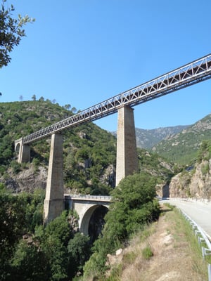 Kurz vor Vivario überfahren wir eine lange Brücke über den Vecchio. Im Hintergrund ist die Pont du Vecchiu erkennbar, welche von Gustave Eiffel konstruiert wurde. Sie dient der Eisenbahn, welche sich auch durch das Gebiet windet und durch viele Brücken über kleine Schluchten führt. Wir nehmen die Ausfahrt und besichtigen dieses 140 m lange Konstrukt.