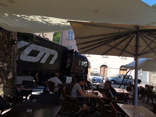 In Vivario machen wir den ersten Stopp und geniessen die Aussicht in die Berglandschaft bei einem Kaffee.