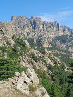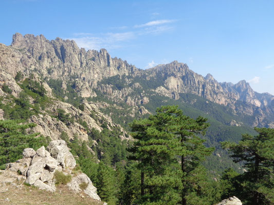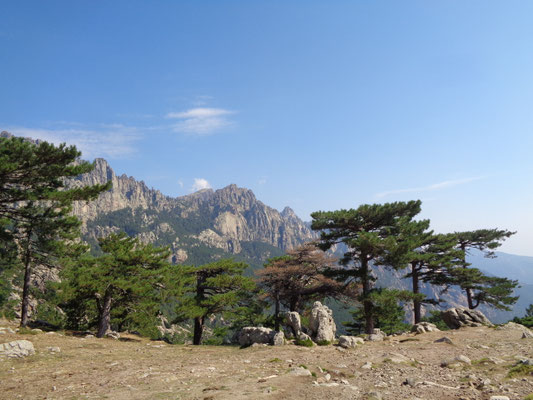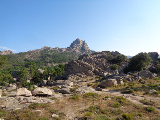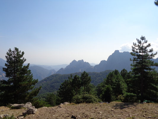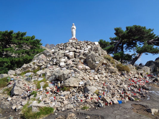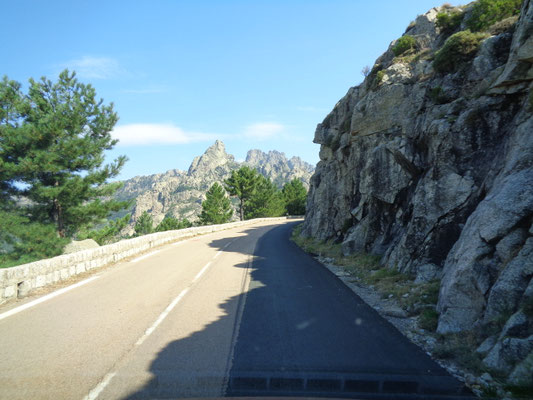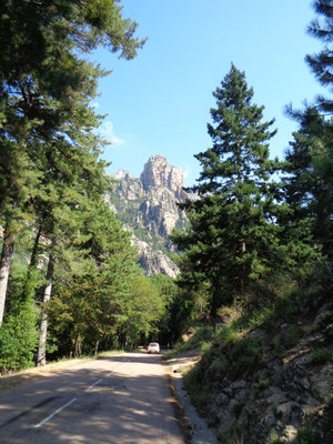 Weiter geht es durch Wald und mit tollen Ausblicken zu den grossen Felsen. Kurz darauf ist der Col de Bavella (1218 m.ü.M.) erreicht. Hier tummeln sich viele Leute. Trotzdem erhaschen wir einen Blick auf die Aiguilles de Bavella, die sieben Felsnadeln. Die Berglandschaft hier ist grandios. Und mitten drin steht die Madonnafigur Norte-Dame-des-Neiges.