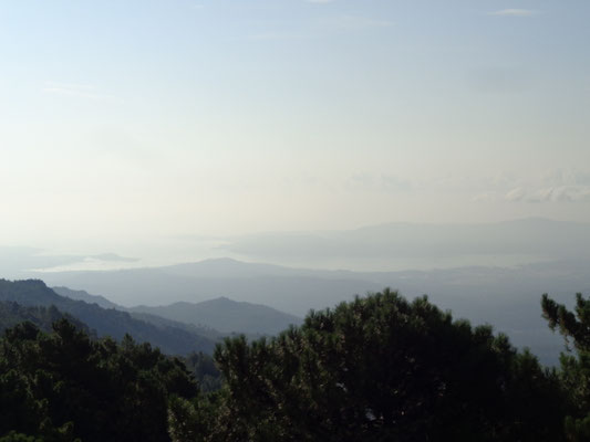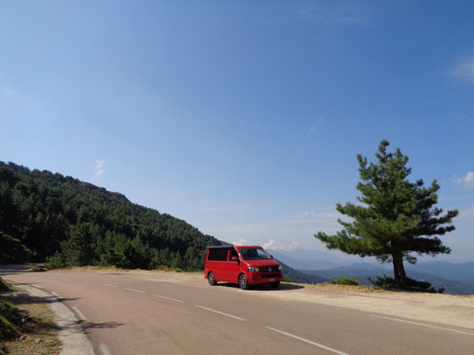 Unsere Fahrt schlängelt langsam den Berg hinauf bis nach L’Ospedale. Von hier oben hat man einen herrlichen Blick in den Golf von Porto-Vecchio. Bereits mitten im Wald und umgeben von grossen alten Kiefern kommen wir an den Stausee von L’Ospedale. Ein idyllischer Ort, welcher zum Wandern einlädt. Es gibt einige Wanderungen zu Wasserfällen, welche wir aber auslassen (wollen wir ja pünktlich auf dem Camping ankommen.
