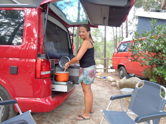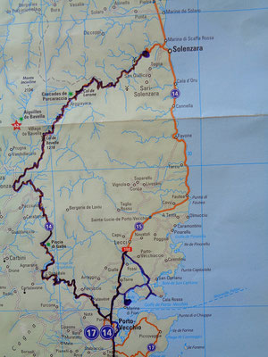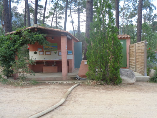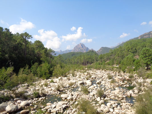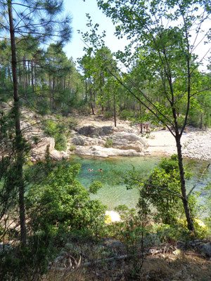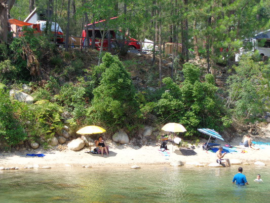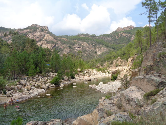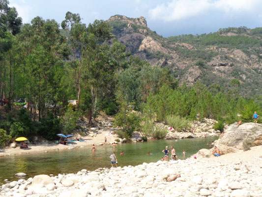 Die Strasse wird enger und wir kurven das Tal inunter. Das Solenzaratal ist ein wildromantisches Tal inmitten der wunderschönen Bergkulisse. Die Solenzara bildet immer wieder grosse Badebecken. Wir checken im Camping U Rosmarino ein, wo wir auch einen Platz bekommen. Der Platz gefällt uns toll, wir sitzen auf dem Plätzchen und schauen direkt auf den Bach. Zum Baden geht die Treppe direkt nebenan runter. Es gibt ein Restaurant und Kiosk, jedoch hat es keinen Strom.
