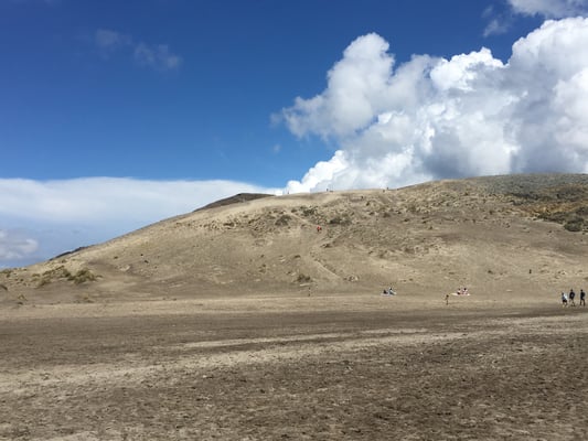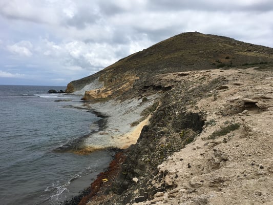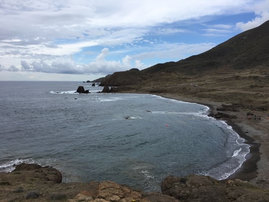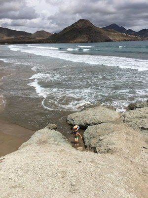Unser erstes Ziel ist der Playa de los Genoveses. Eine wunderschöne lange Bucht mit vielen verschiedenfarbigen vulkanischen Gesteinen. Die Kinder baden ihre Füsse und es dauert nicht lange bis sie in den Unterhosen im Meer baden. Curdin und ich wandern noch auf den Hügelgrat, um zu sehen, was danach für eine Bucht kommt.