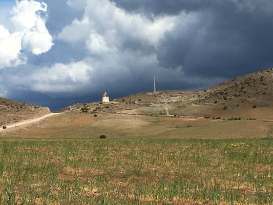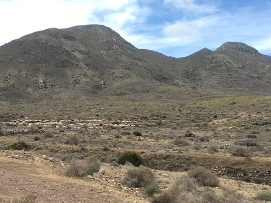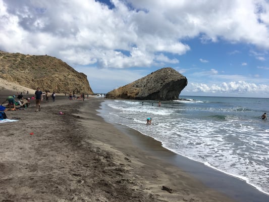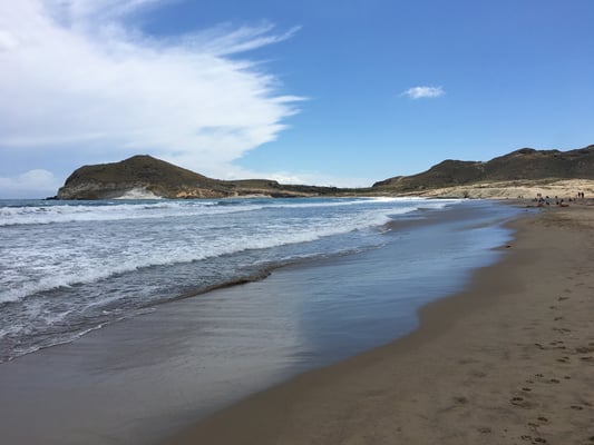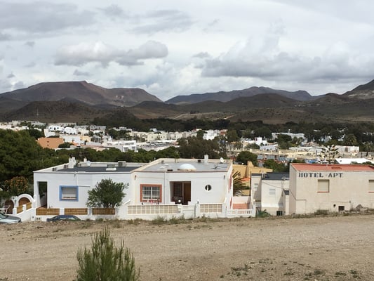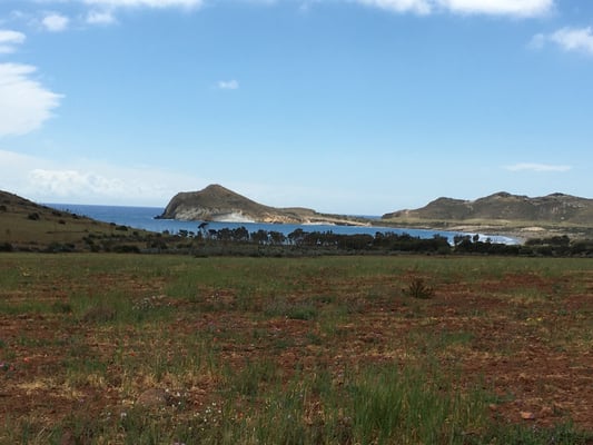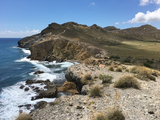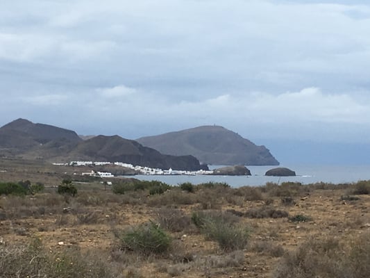 Etwas später verziehen sich auch die dicken, schwarzen Wolken und wir brechen auf zum Strand von Los Escullos. Es ist ein schöner Marsch über die Steppe bis zu den weissen Felsen und dem Kastell am Stand. Aus der Disco strömen gerade noch die letzten Raver nach einer durchgetanzten Nacht. Wir klettern auf den Kalkfelsen herum und geniessen unser Picknick.