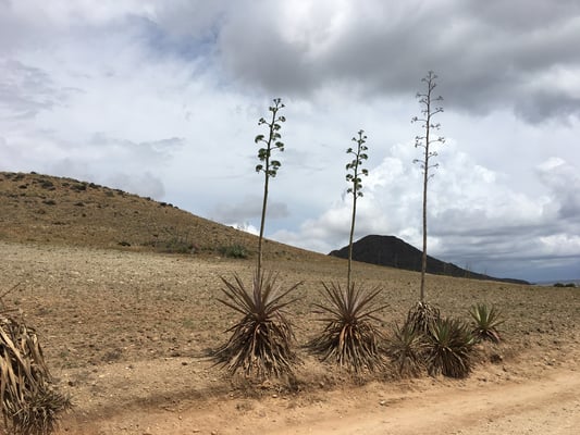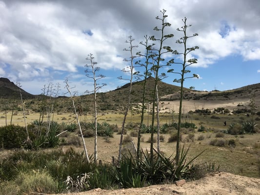 Wieder im Bus fahren wir weiter zur nächsten Bucht, der Playa del Monsul. Durch die hochstängligen Agavengewächse und die Buschpalemen und vorbei ein einer grossen Sanddüne erreichen wir die Bucht mit den vulkanischen Gesteinsformationen.