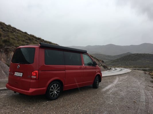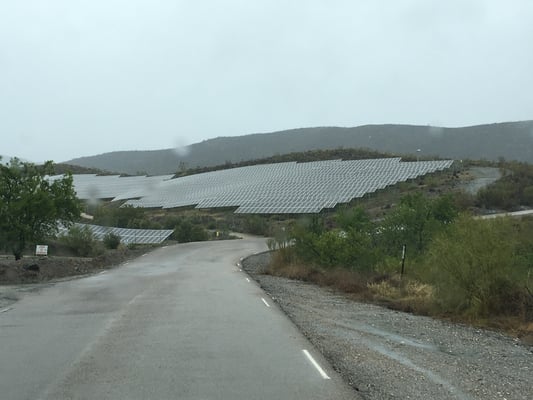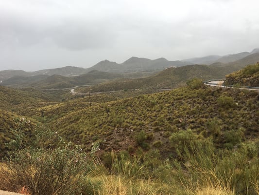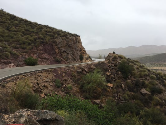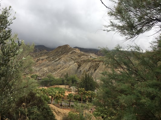 Die Strecke zwischen Sorbas und Tabernas ist sehr gut ausgebaut und wir schauen über riesige Olivenplantagen. Leider regnet es zeitweise in Strömen, was für diese Gegend – anscheinend die niederschlagärmste in Europa – wohl sehr selten ist.