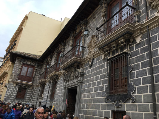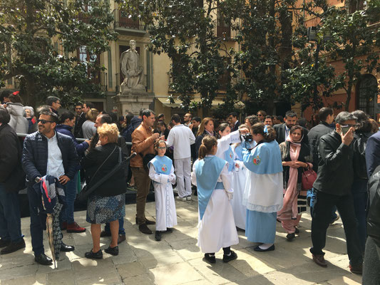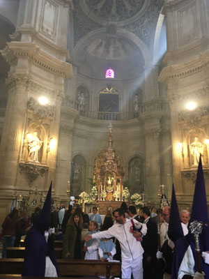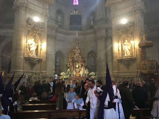 Wieder draussen landen wir in einer enormen Menschenmenge und realisieren etwas zu spät, dass wir mitten in einer Osterprozession stehen. Wir hören den Umzug von etwas weiter weg, aus dem Schiff der Kathedrale, welches wir gerade besichtigen wollen, kommt Weihrauch getragen von den Ministranten und danach violette Nazarenern mit den typischen spitzen Mützen und den Gesichtsmasken. Trotz Prozession erhaschen wir einen Blick ins Seitenschiff und danach in die Kathedrale. Es ist gerade Messe und ein schöner Gesang hebt die prunkvolle Kathedrale noch in eine schönere Stimmung.