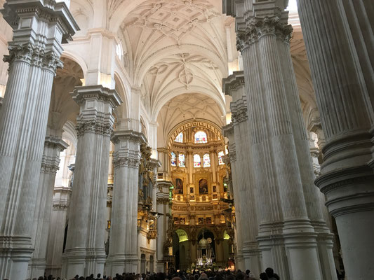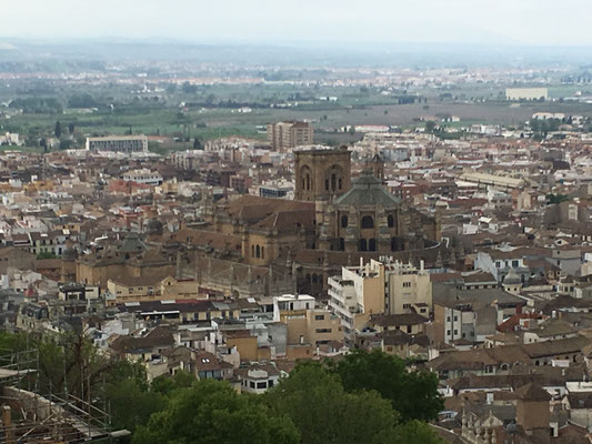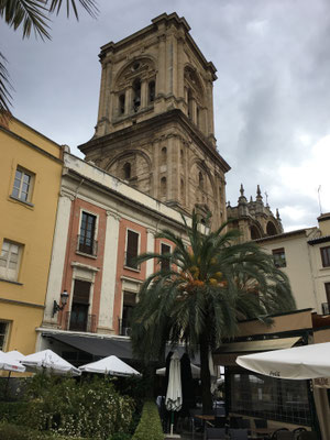 Gemütlich frühstücken wir und machen uns auf den Weg in die Stadt mit dem öffentlichen Bus. Für 1.5 Euro bringt er uns bis zum Paeso del Triunfo. Wir beginnen unseren Stadtrundgang durch die Altstadt. Das maurische Stadttor Puerta Elvira ist unser erstes Motiv. Um elf Uhr ist noch nicht viel offen, nur einige Bäckereien locken mit ihren feinen Angeboten. Vorbei geht’s am barocken Hospital San Juan de Dios und dem Monasterio San Jerónimo mit einer Fassade von Diego de Siloé durch weitere schöne Altstadtgassen bis zur Kathedrale. Wir schlendern um das imposante Gebäude und landen in der Kolonne für die Capilla Real (Königliche Kapelle). Mit einer deutschen Audioguide begehen wir die Kapelle und staunen über den Prunk und die beiden Marmorgrabmäler der katholischen Könige.