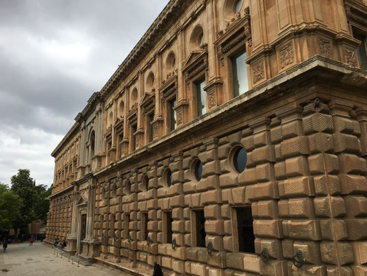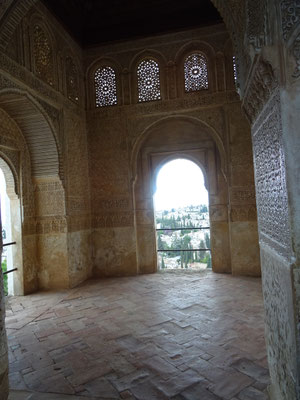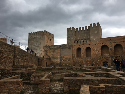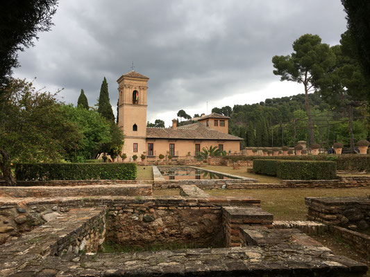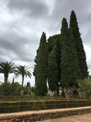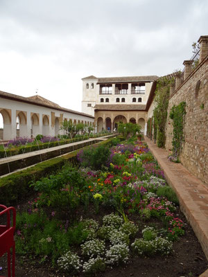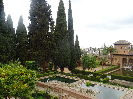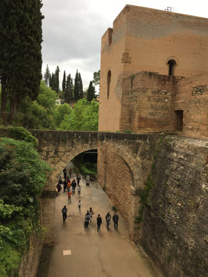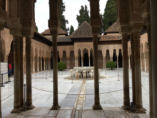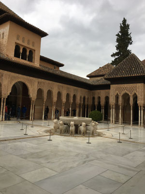 Wir marschieren Richtung Alhambra und essen in einem Restaurant unser Mittagessen. Die Zeit drängt, denn um 14 Uhr müssen wir pünktlich beim Ticketschalter stehen. Die Gassen sind schlecht beschriftet und wir irren erst etwas umher, am Schluss rennen wir noch den Berg hinauf. Doch wir schaffen es in letzter Minute und werden schon von einer deutschen Frau erwartet. Wir erhalten einen Kopfhörer, wo wir ihre Ansagen hören. Sie führt uns in angenehmem Tempo und in einer gut gewählten Tour durch alle wichtigen Orte der Alhambra. Durch die Gartenanlage geht es zur früheren Stadt und den Werkstätten weiter zu der Zitadelle und den Unterbringungen der Armee, danach durch den wahnsinnig eindrücklichen Nasriden Palast, den Myrtenhof und den Löwenhof, sowie dessen Gärten. Danach betreten wir den Palast Karls V und wandern durch die Gartenanlagen in den Sommerpalast Generalife. Die ganze Tour dauert 3.5 Stunden und die Kinder machen hervorragend mit, denn es istsehr spannend, was wir alles erfahren haben. Wir sind trotz Menschenmenge und Touristenhochburg begeistert über dieses Monument und froh, dass wir dies heute erleben durften.