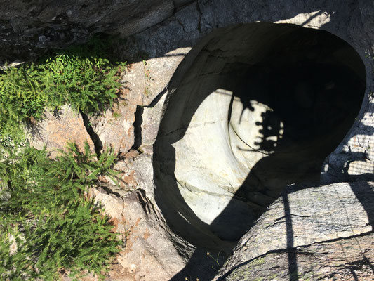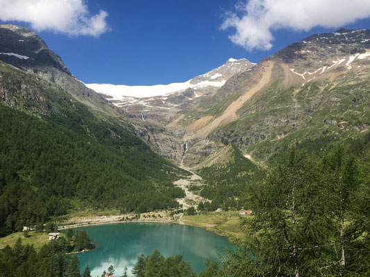 Unsere Nacht auf dem Camping Boomerang ist angenehm. Am frühen Vormittag sind wir dann von Li Curt mit der RhB bis zur Alp Grüm gefahren. Von dort aus wandern wir, den beeindruckenden Bernina-Gletscher immer im Visier, vorbei an den blauen Gletscherseen zum Flussbett und zurück. Weiter geht es bis nach Cavaglia und in den Gletschergarten.