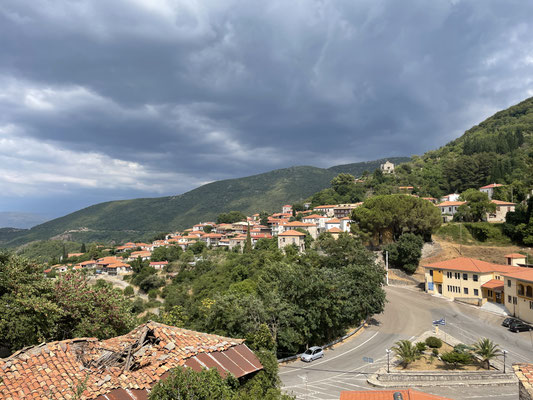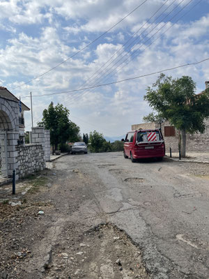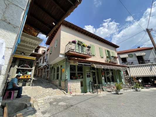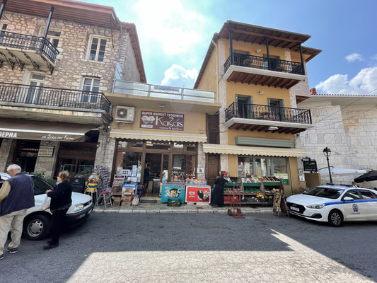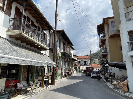 In Dimitsàna angekommen genehmigen wir uns einen Toast und ein kühles Getränk. Dabei beobachten wir das rege Treiben im Dorf. Den Polizisten auf dem Balkon, welcher viele Passanten kennt. Die Mönche, welche im Minimarket anstehen, Touristen-Familien, Autos, die durch Gassen fahren, die viel zu schmal wirken...