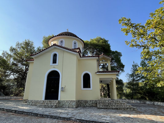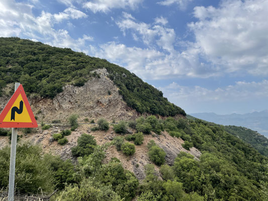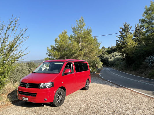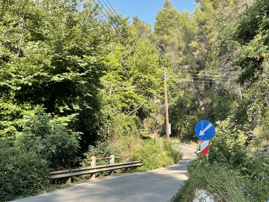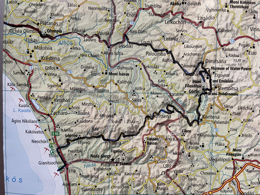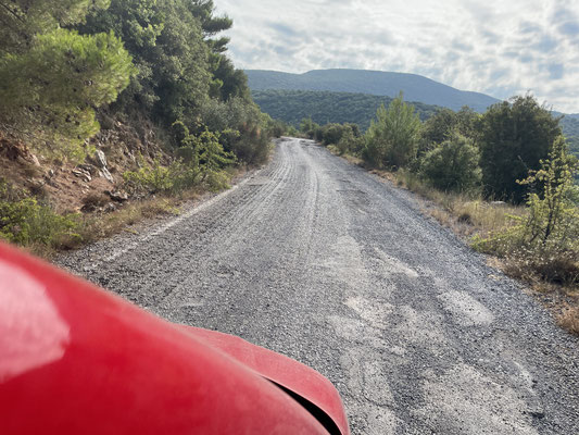 Die Fahrt von Olympia bis nach Dimitsàna dauert über eine Stunde. Wir schlängeln uns entlang dem Berg durch schöne Föhrenwälder immer höher hinauf. Wir durchqueren einige kleine Dörfer. In jedem hat es eine Taverna und es sitzen ein paar Mannen drin, welchen wir freundlich winken. Wir sind froh, keinen grossen Camper zu haben, denn die Strassen werden immer schmaler. Auffallend ist, dass man sich nicht auf die Strasse verlassen kann, denn es kann sein, dass nach einigen Kilometern der Strassenzustand bereits viel schlechter oder schmaler ist, wie zuvor.
