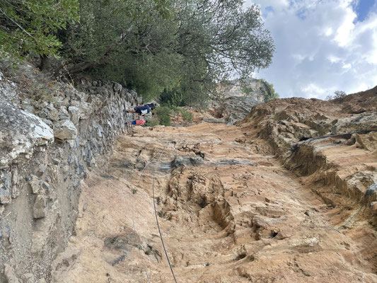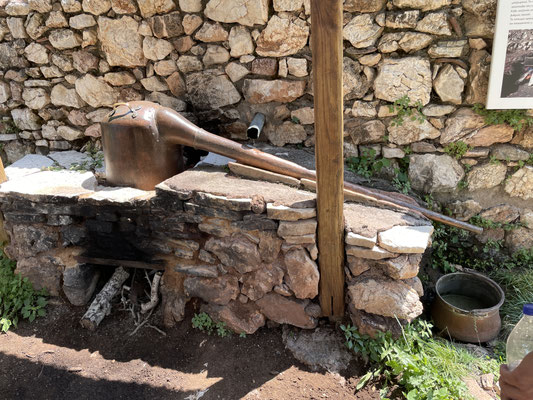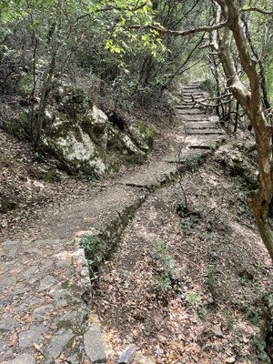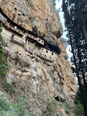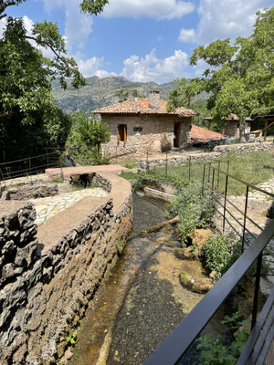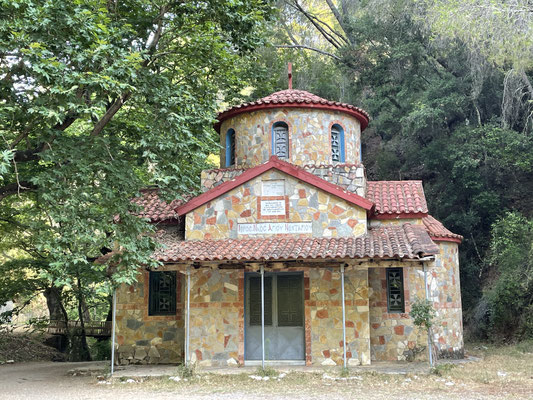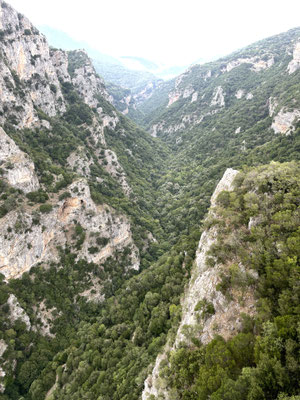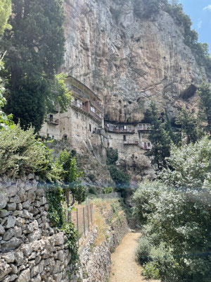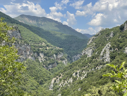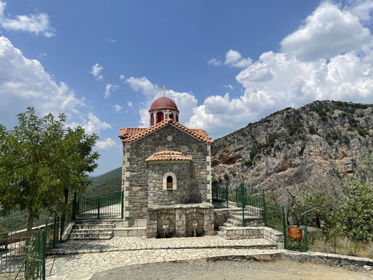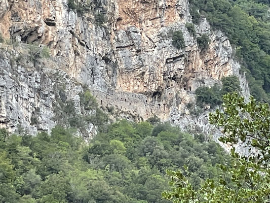 Weiter ging die Fahrt auf einer sehr schmalen und mit Schlaglöchern übersäten Strasse, spektakulär ins Tal hinunter bis zum Parkplatz nahe des Klosters Pródromou. Wir laufen 20 Minuten runter zum Kloster, welches spektakulär in den Fels gebaut wurde. Es wird immer noch von acht Mönchen bewohnt. Es ist sechsstöckig und nur mit Holzgeländern zu den oberen Stockwerken gesichert. Von da wandern wir weitere 1.5 km runter durch wunderbaren Wald bis zum Fluss Louisios und der Brücke. Wir baden die Füsse. Den Aufstieg zum alten Kloster Filosófou lassen wir aus, denn schon die beiden Wege bis zum Auto sind bei dieser Wärme genug für uns.