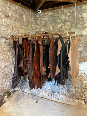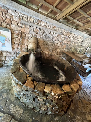 Hier ist auch der Startpunkt für die Fahrt ins Loúisos-Tal. Unser erster Stopp gilt dem Wasserkraft-Museum. In diesem wird ganz anschaulich dargestellt, wie die Wasserkraft im Tal nicht nur zum Mahlen von Getreide genutzt wurde, sondern zum Waschen von Teppichen, zum Gerben von Leder und um Schwarzpulver herzustellen. Letzteres war ein sehr wichtiges Produkt für diverse Kriege und Austragungen. Dimitsàna war daher bekannt, Männer mussten nicht in den Krieg ziehen, da sie für die Produktion des Schwarzpulvers zuständig waren.
