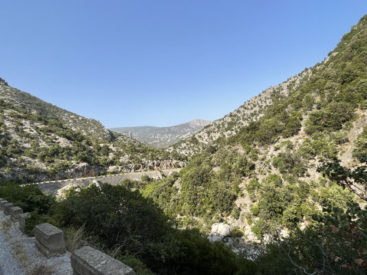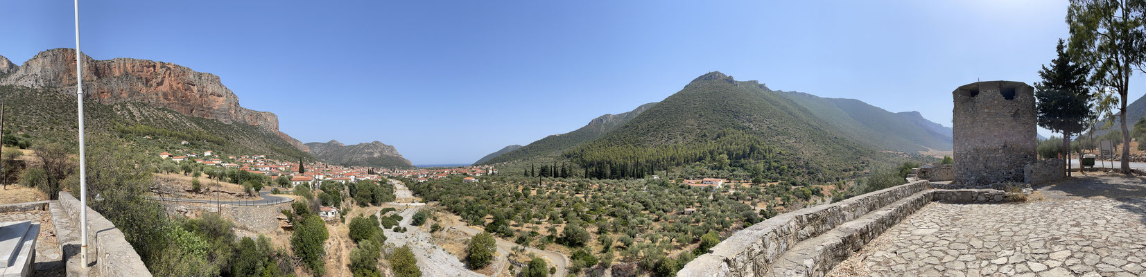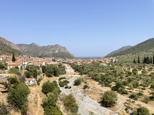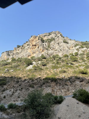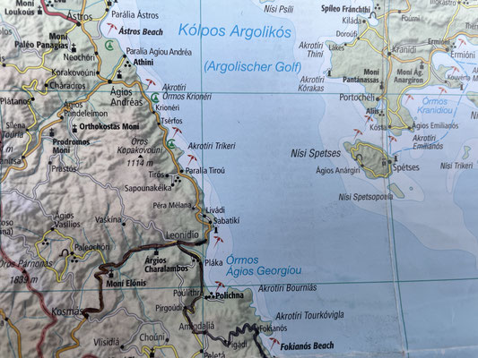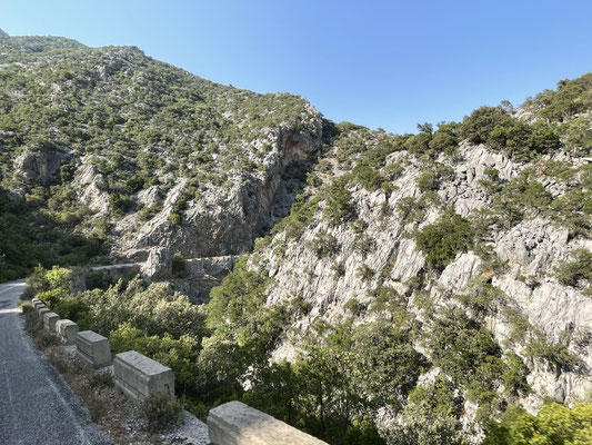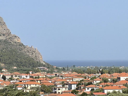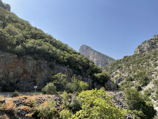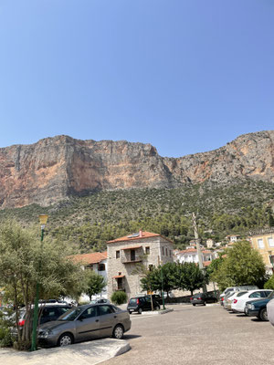 Nach einem griechischen Salat mit Toast klappen wir unser Dach ein und fahren Richtung Leonídio. Diese Stadt liegt prächtig unter einem senkrechten Felsen. Die Gegend ist bekannt für Kletterer. Es gibt über 100 Routen zu klettern.