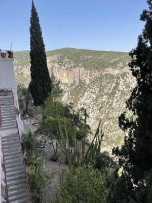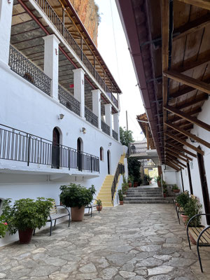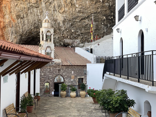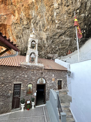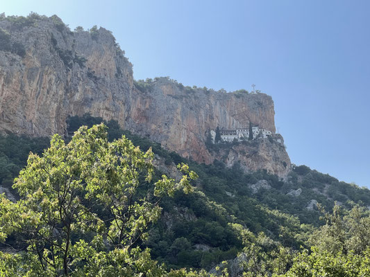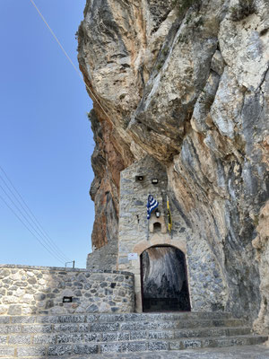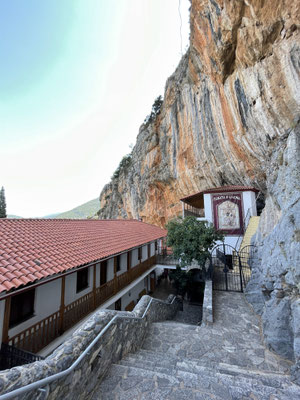 Hinter Leonídio kommt man direkt in die Dafnón-Schlucht. Die Strasse schlängelt sich durch diese imposante Schlucht. Das ausgetrocknete Flussbett immer auf der einen oder anderen Seite. Nach einigen Kilometern entdecken wir das Kloster Elónis, welches hoch oben in der roten Felswand klebt. Es scheint kaum zu erreichen. Doch einige Serpentinen weiter und höher kommt man ganz einfach über eine 200 m lange Stichstrasse zum Kloster. Wir besichtigen es und stellen uns das Leben hier oben in der Felswand vor.