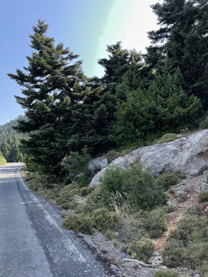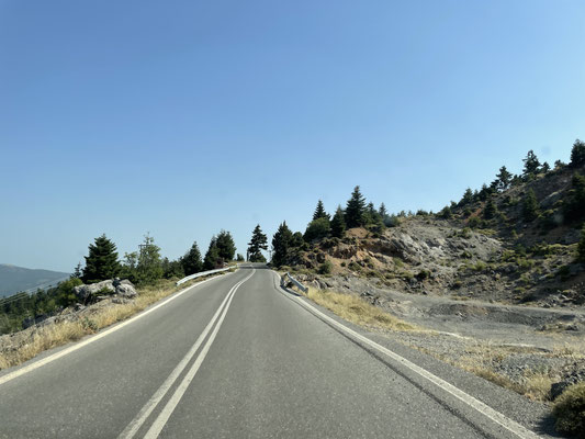 Wir fahren die letzten Kurven hoch bis auf die Passhöhe und bis ins Zentrum nach Kosmas auf 1150 m.ü.M. Hier wollten wir eigentlich etwas Kühles trinken, aber das Benzin ist knapp und wir sind etwas nervös und kehren daher schnurstracks um. Vorsichtig rollen wir wieder 1000 Höhenmeter ins Tal, schauen, dass wir nicht zu viel Motorkraft brauchen und schaffen es bis zur Tankstelle. Wir hatten noch ganze 7 dl im Tank. Uff! Noch einmal Glück gehab!