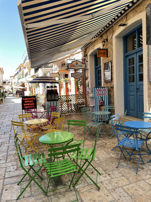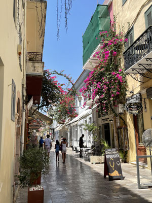 So finden wir uns wenige Minuten später in der schönen Altstadt wieder. Wir parkieren ganz oben vor der Festung Akronauplia. Sie wird überragt von zwei grossen Festungen und man schlendert durch schön restaurierte enge Gassen mit vielen Tavernen, kleinen Hotels und unzähligen Touristen-Shops.