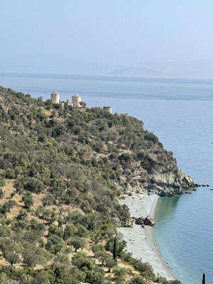 Gemütlich packen wir nach dem Frühstück unsere Sachen und machen uns auf den Weg Richtung Náfplio. Wir schlängeln auf der gut ausgebauten Strasse der Küste entlang. Die Bergregion schafft immer noch steile Küsten und wunderschöne Buchten mit weissem Kies kommen in unser Blickfeld. Wie entdecken auch einige runde Wehrtürme. Langsam flacht es ab.
