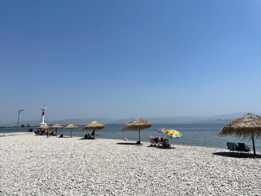 vor Náfplio nicht zum Baden einlädt. Die Stände sind schmal und das Wasser trüb mit viel Seegras drin.