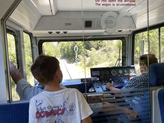 Zweieinhalb Stunden später geht die Fahrt auch schon wieder zurück. Wir haben Poleposition, da die Plätze reserviert sind. Wir sitzen direkt hinter dem Zugführer und haben eine geniale Aussicht direkt auf die Schienen und die Abfahrt ins Tal.