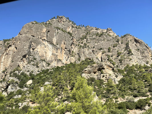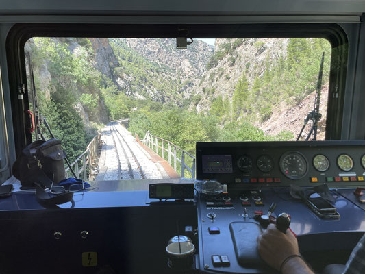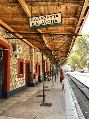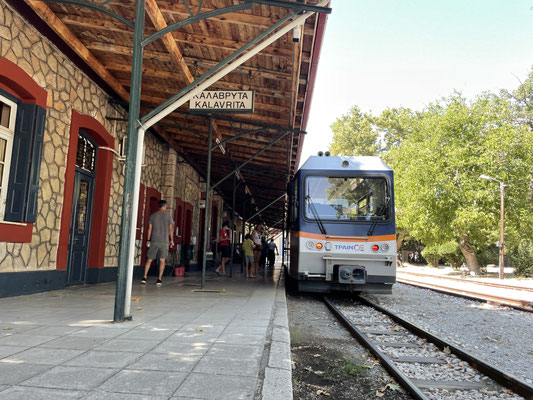 Pünktlich um neun Uhr machen wir uns auf den Weg Richtung Diakoptó, denn um 9.52 Uhr fährt die Zahnradbahn ab. Die Fahrt in den zwei Wagons führt uns spektakulär durch die Vouraiikós-Schlucht. Die Strecke führt über 40 Stahl- und 15 Steinbrücken. Auf insgesamt drei Strecken wird das Zahnrad zugeschaltet, da es ein Gefälle von bis zu 14.5 % vorweist. Der Zug fährt unten am grünen Wildwassertal, während senkrechte Felswände emporsteigen. Wir fahren durch Felsgalerien und Tunnels. Die Schmalspurbahn (75cm) kurvt manchmal so nahe und nur durch Stützmauern gestützt oder über geländerlose Brücken am Abgrund. Spektakulär!