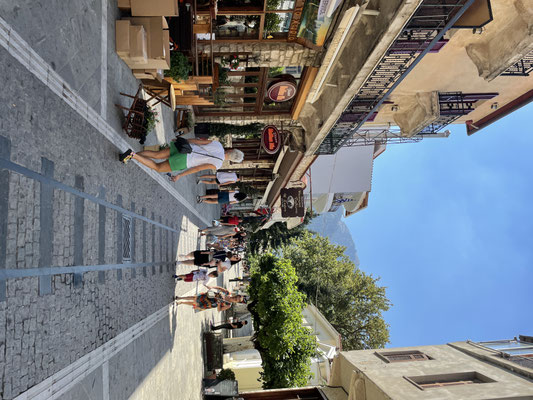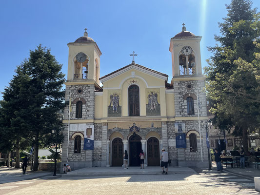 Eine Stunde später stehen wir am kleinen Bahnhof von Kalávrita. Dieser Ort ist bei den Griechen ein beliebtes Ski- und Aprés-Skigebiet. Das schmucke Dörfchen ist voll auf den Tourismus ausgerichtet. Wie schlendern durch die autofreie Hauptstrasse, kehren natürlich ein und kaufen noch ein weiteres Geschenk für Andri.