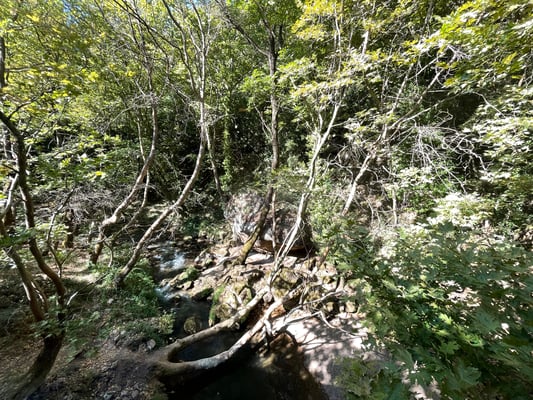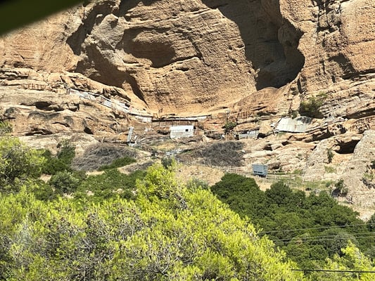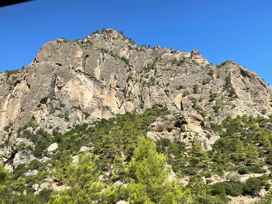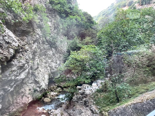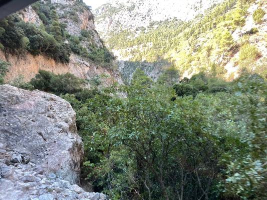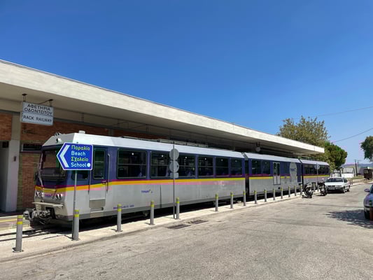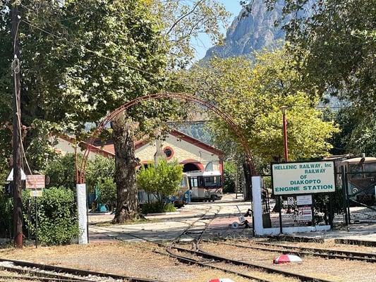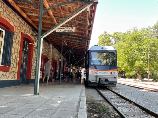 Pünktlich um neun Uhr machen wir uns auf den Weg Richtung Diakoptó, denn um 9.52 Uhr fährt die Zahnradbahn ab. Die Fahrt in den zwei Wagons führt uns spektakulär durch die Vouraiikós-Schlucht. Die Strecke führt über 40 Stahl- und 15 Steinbrücken. Auf insgesamt drei Strecken wird das Zahnrad zugeschaltet, da es ein Gefälle von bis zu 14.5 % vorweist. Der Zug fährt unten am grünen Wildwassertal, während senkrechte Felswände emporsteigen. Wir fahren durch Felsgalerien und Tunnels. Die Schmalspurbahn (75cm) kurvt manchmal so nahe und nur durch Stützmauern gestützt oder über geländerlose Brücken am Abgrund. Spektakulär!