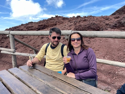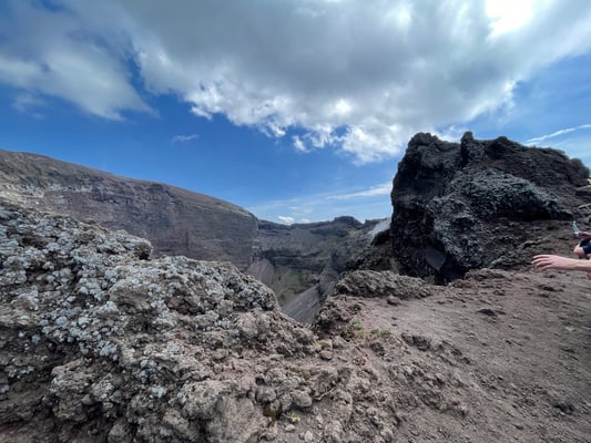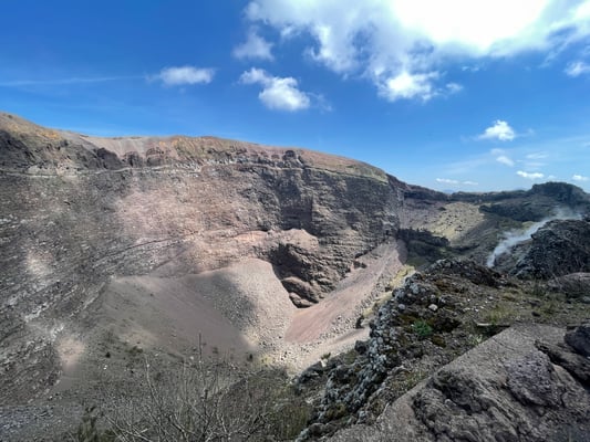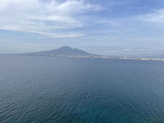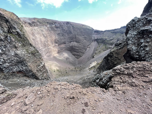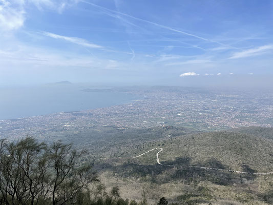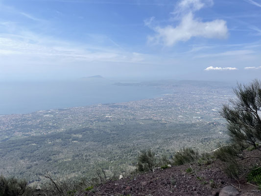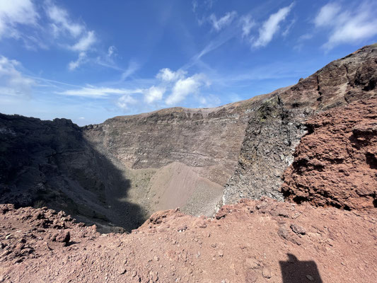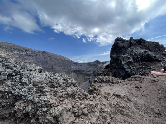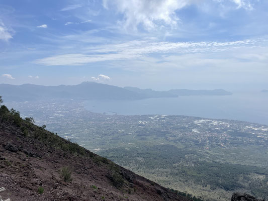 Den Aufstieg geniessen wir dann sehr. Wir haben zwei Stunden Zeit. Trotz des Ansturms sind nicht zu viele Leute aufs Mal unterwegs. Die Aussicht in den Golf von Neapel spektakulär, auch mit dem Wetter hatten wir Glück. Der Krater ist gross und man sieht gut hinein, die Farben des Vulkangesteins eindrücklich. Hier und dort riecht es nach faulen Eiern, es räuchelt an manchen Stellen.
