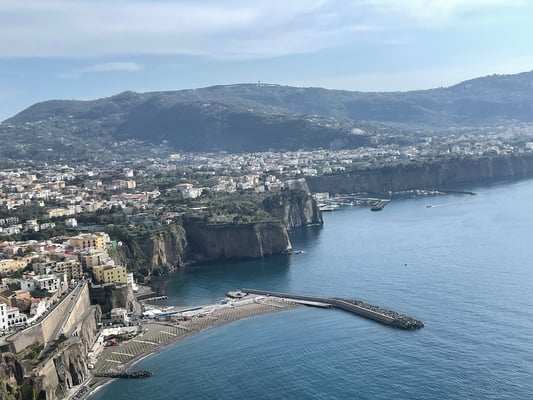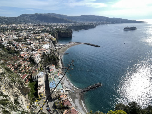 Wieder in Pompeji holen wir unser Auto auf dem Parkplatz (hinter dem Camping Zeus, günstiger) ab und fahren die knappe Stunde nach Sorrento. Kaum auf der Peninsula Sorrentina angekommen wechselt die Atmosphäre. Alles ist viel aufgeräumter und sauberer. Die Städtchen haben Charme, dazwischen etwas Grün, nette Cafés und geschäftiges Treiben. Die Fahrt dauert etwas länger, da wir zwischen 16 und 17 Uhr im Berufsverkehr landen, dies lässt aber zu, dass man mehr erblickt bei der Durchfahrt. Am Camping Nube D’Argento bekommen wir einen grossen Platz mit Meerblick. Das lädt ein, um einen Aperitivo zu geniessen.