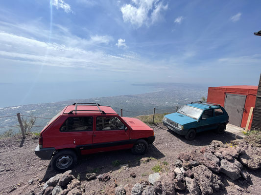 Noch schnell ein Panino zur Stärkung und schon sitzen wir in dem komfortablen Bus Richtung Vesuvio. Sehr entspannt ist die Fahrt, wenn man nicht selbst zirkeln muss. Oben angekommen hat sich das Kombi-Ticket schon wieder gelohnt. Der öffentliche Parkplatz liegt viel weiter unten und man hätte der befahrenen Strasse entlang noch sicher 30 Minuten gehen müssen, nicht ganz ungefährlich. Und oben ist es so voll, dass auch hier das Wenden nur auf die gelassene italienische Art funktioniert.