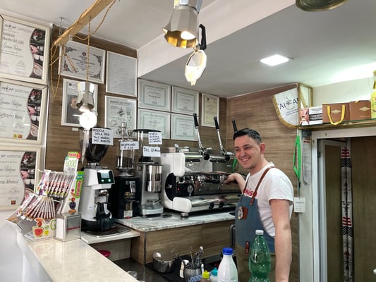 Wenig später werden wir an der geschäftigen Hauptstrasse angesprochen und in eine unscheinbare Bar gelotst. Wir kommen mit dem Barista Gennaro ins Gespräch und erfahren einiges über seine Künste. Die Kinder staunen nicht schlecht, dass man hier die Cornetti vuoti gerade befüllen lassen kann, zur Auswahl stehen Kinder-Buono oder Schokolade.