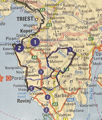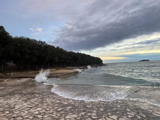 Heute Morgen beginnt es gegen 7 Uhr zu regnen. Wir essen unter der Markise noch gemütlich unser Frühstück. Als wir gegen halb 10 Uhr losfahren beginnt es aber stärker zu regnen und wir sitzen gemütlich im warmen Auto, hören Musik und fahren Richtung Pazin.